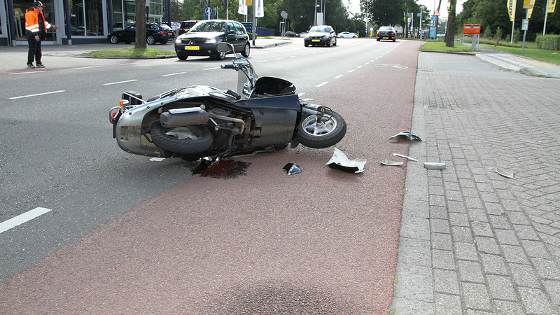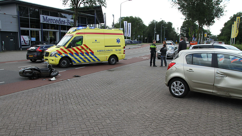 De vrouw stopte echter niet en haalde in plaats daarvan de auto voor haar aan de linkerkant in, waarna de botsing met de tegenligger volgde. Ze is met onbekend letsel afgevoerd naar het ziekenhuis. Haar scooter is zwaar beschadigd. De bestuurder van de auto waarmee de scooterrijdster botste is ongedeerd. De auto heeft wel op op drie plaatsen forse deuken in zijn auto. (foto: DNP.NU)