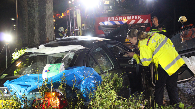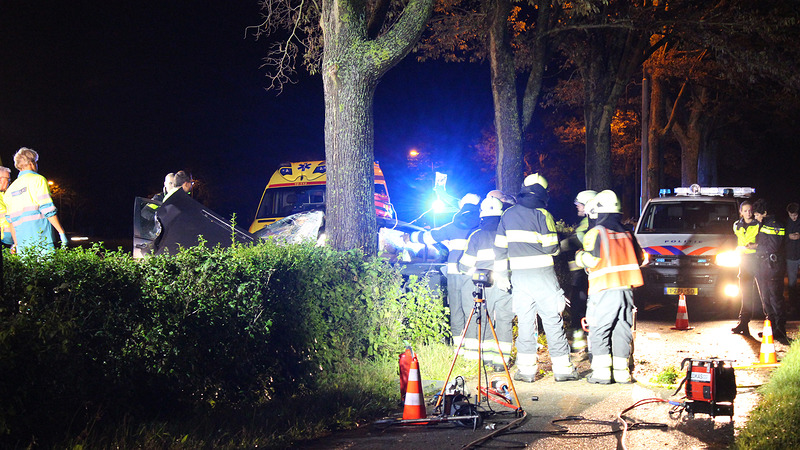 De brandweer en de ambulancedienst kwamen beide met twee voertuigen ter plaatse. Nadat de brandweer de autodeur verwijderd had kon de bestuurder uit zijn benarde positie bevrijd worden. Hij is onder begeleiding van de trauma-arts van VU Medisch Centrum naar het ziekenhuis gebracht. (foto's: DNP.NU/Lorenzo Derksen)
