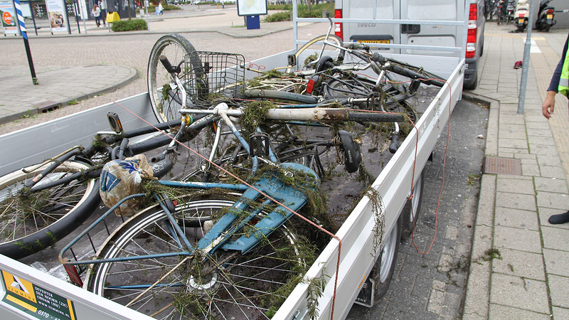 De fietsen waren weliswaar licht aangeslagen door hun verblijf in het water, maar zagen er verder nog goed uit. Eรฉn fiets was zelfs nog bijna schoon en lag er dus waarschijnlijk nog niet lang in. De fietsen gaan nog een maand in opslag, enย daarna gaan ze naar de schroothoop. (foto's: DNP.NU)