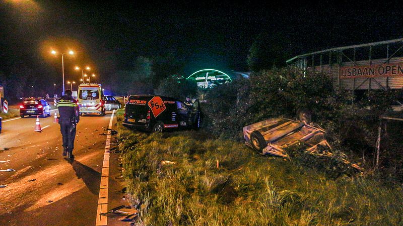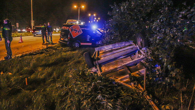 De bestuurder is meegenomen naar het ziekenhuis. Zijn auto kwam naast de weg tot stilstand en heeft veel schade opgelopen. Het is nog onbekend hoe de aanhanger heeft kunnen losraken.