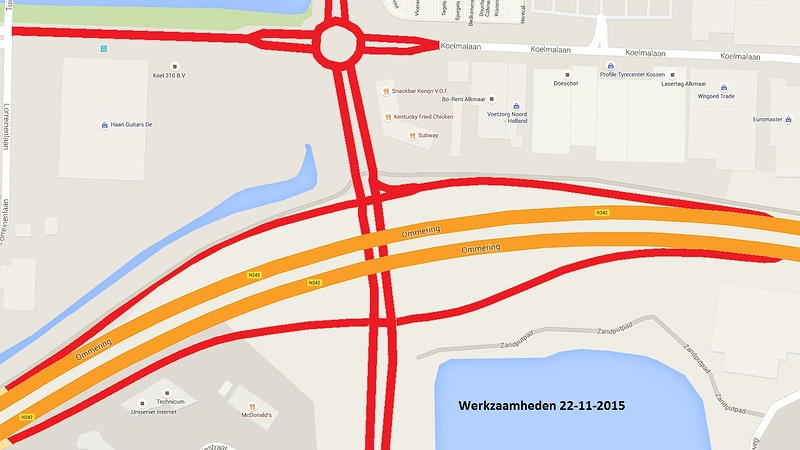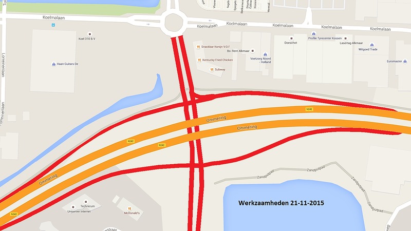 Zaterdag 21 en zondag 22 november worden de definitieve deklagen en belijning aangebracht op de Koelmalaan, Bestevaerstraat, Diamantweg en op de toerit van de N242 richting Heerhugowaard. Hiertoe wordt op zaterdag om 07:00 uur de Bestevaerstraat en de Diamantweg afgesloten tussen de rotonde met de Koelmalaan en de Robijnstraat.Ook de toe- en afritten van en naar de N242 zijn dicht. Industrieterrein Overdie is bereikbaar via de Koelmalaan of de Laanenderweg. Wederom zullen omleidingsroutes aangegeven worden. In verband met de thuiswedstrijd van AZ eindigen de werkzaamheden op zaterdag 21 november om 16:00 uur. Zondag om 07.00 uur wordt de Koelmalaan (vanaf de Lorreinenlaan) inclusief de rotonde afgesloten. Ook worden de Bestevaerstraat, Diamantweg en de toe- en afritten van de N242 afgesloten. Industrieterrein Overdie is bereikbaar via de Boekelermeer en de Laanenderweg.