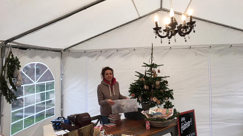 Op de grasmat ligt worteldoek bedekt met houtsnippers voor een gezellige sfeer. In de tent waait het wel behoorlijk. De lamp ziept alle kanten op, maar evengoed is het er beregezellig. (foto's DNP.nu)