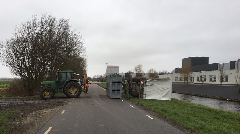 De groente, die volgens de kwekers geen vorst meer nodig heeft om op smaak te komen, moest hierdoor later door andere voertuigen worden opgehaald. Ook de aanhanger zal op een later tijdstip worden rechtgezet, maar dat kan pas zodra het wat minder hard waait. (fotoβs: DNP.NU)