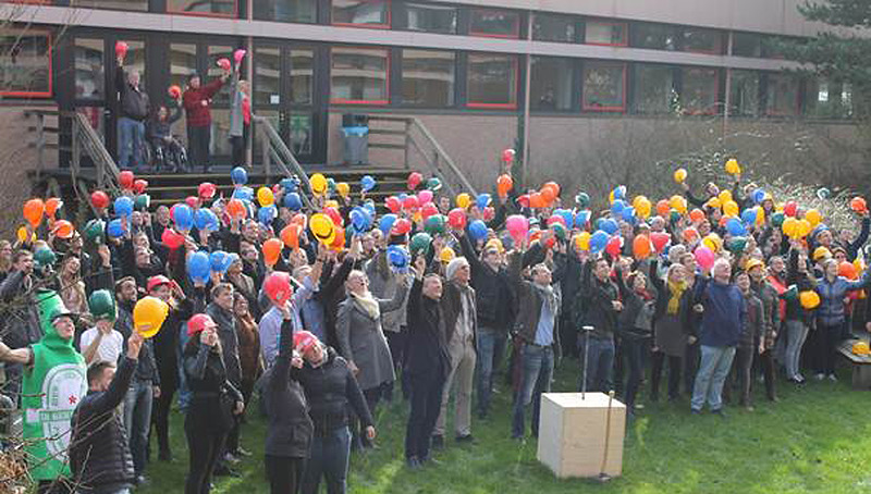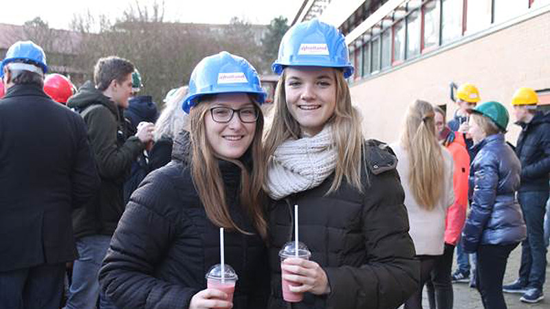 "Dit is het kortste studentenfeest ooit", riep Alex de Jager, strategisch relatiebeheerder bij Inholland Alkmaar, door de megafoon. "Heeft iedereen ook al een bouwhelm?" Toen iedereen een kleurige helm had werd een groepsfoto gemaakt.