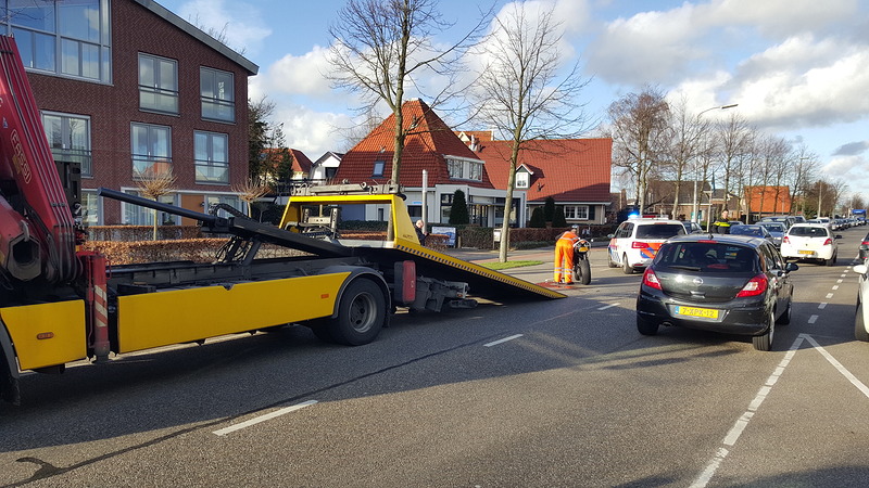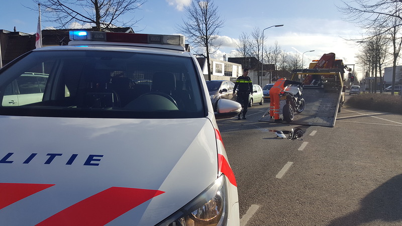 De auto liep lichte schade op en kon na de afhandeling doorrijden. De motorrijder raakte gewond en is naar ziekenhuis gebracht. Een oliespoor met brandstof van de motor is opgeruimd door de gemeente. (foto's: DNP.NU/Lorenzo Derksen)