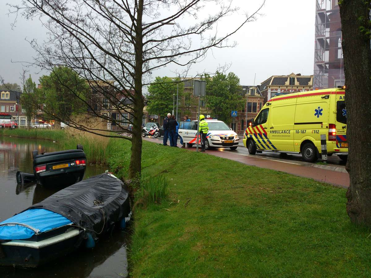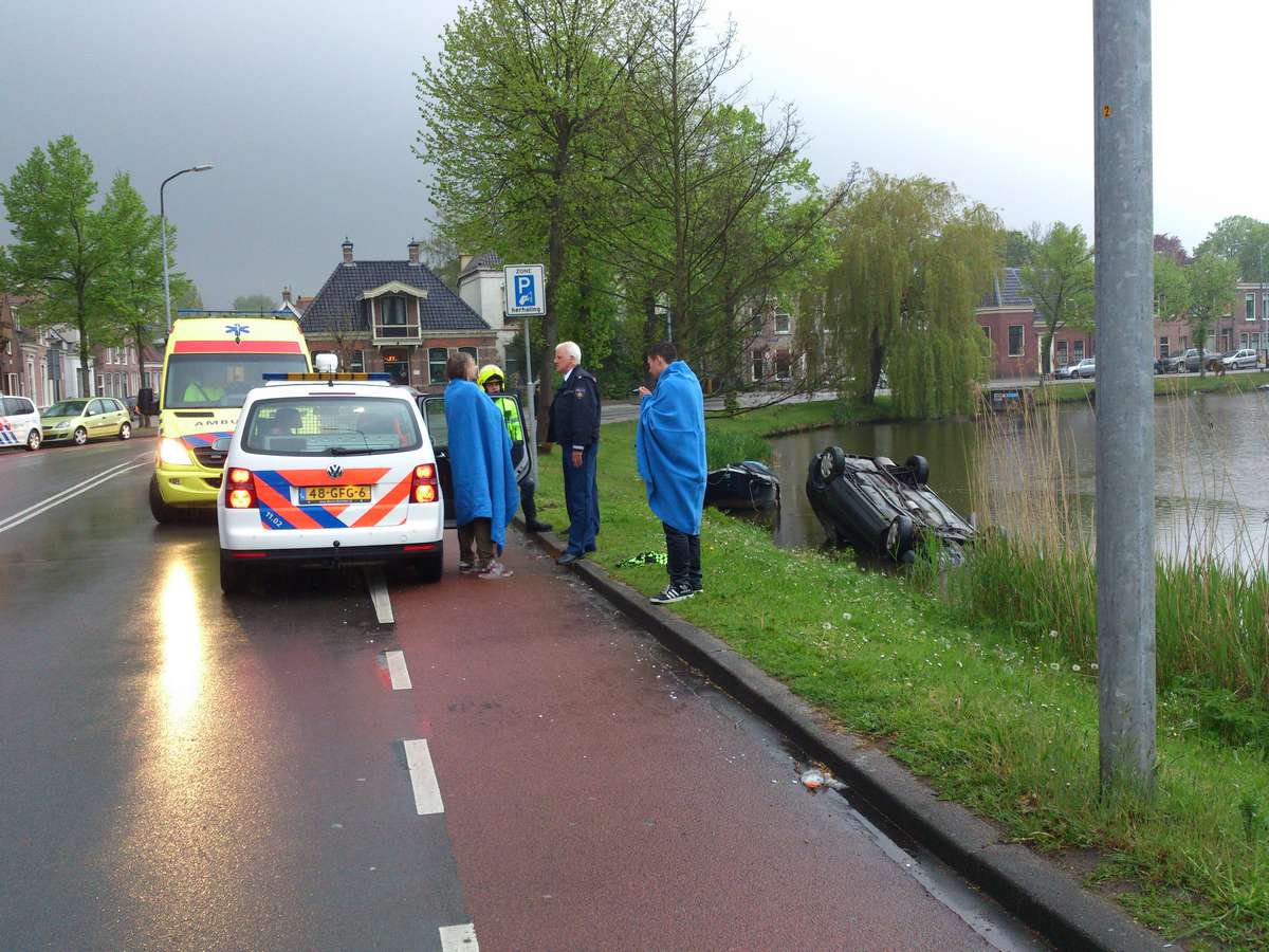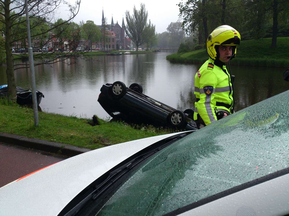 Alkmaar 08 mei 2012. Maandagavond even voor acht uur is een zwarte toyota Corolla met daarin twee inzittenden op de kop in het water van de Geestersingel in Alkmaar beland. de auto kwam vanaf de Kennemerstraatweg en wilde met de knik in de weg mee de Geestersingel op toen het mis ging. Waarschijnlijk heeft het voor het door de regen glad geworden wegdek een rol gespeeld bij het ongeval: de auto raakte met het rechtervoorwiel de stoeprand en raakte na een correctie in de slip, kwam in de berm terecht en sloeg over daar de kop het water in waar de auto bleef liggen. een voorbijganger aarzelde geen moment en sprong in het water en maakt het portier open waardoor de chauffeur en zijn passagier uit de auto konden komen. Volgens de politie heeft het feit dat beiden de gordel om hadden ze waarschijnlijk gered.