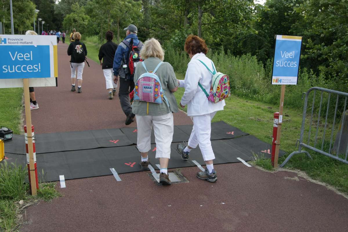 Alkmaar, 23 juni 2012. Vandaag is natuurlijk de belangrijkste dag voor de wandelaars van de Plus Wandel4Daagse want vandaag is de grote intocht in Alkmaar. Wie dat heeft gehaald kan aanspraak maken op het kruisje en eeuwige roem. De start was vandaag weer bij Sportcomplex Oosterhout en de route voerde de wandelaars via het stadspark Rekerhout in Alkmaar-Noord en recreatiegebied Geestmerambacht. In het Geestmerambacht buigt de 20 km af in westelijke richting; de 25 en 37,5 km wandelaars vervolgen de route dit jaar via de wandelpaden aan de oostzijde van het water in het recreatiegebied. De lange afstand wandelaars lopen door het gebied van Warmenhuizen met tal van wisselende vergezichten op polders en duinen vanaf de Westfriese Omringdijk. In Alkmaar passeren alle afstanden (ook de 8,5 en 15 km) het Stadskantoor met een blik op het vernieuwde Bolwerk en de vernieuwde Paardenmarkt. Via de Stadswallen en de zonnebloemen locatie wordt de karakteristieke Molen van Piet bereikt. Waarna de feestelijke intocht de wandelaars dwars door het Waaggebouw naar de finish op het Waagplein brengt. Net als op de voorgaande drie dagen was sportfotograaf Peter Heins weer van de partij en hij maakte deze uitgebreide reportage.