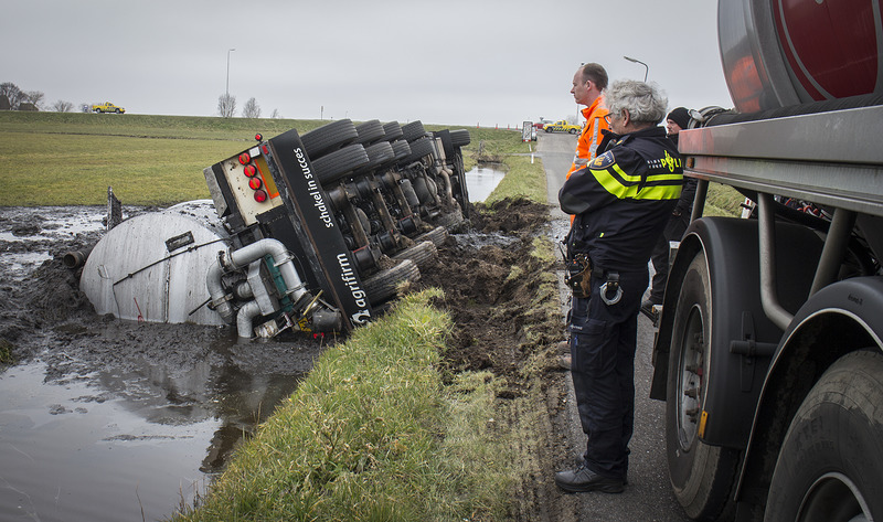 De berging gaat wel even duren. Eerst moet de lading overgepompt worden en een telekraan past niet op het smalle weggetje. Er liggen ook nog eens kabels en leidingen in de berm. Bellen is ieder geval in omliggende boerderijen niet mogelijk. (foto's: Richard v.d. Veen)