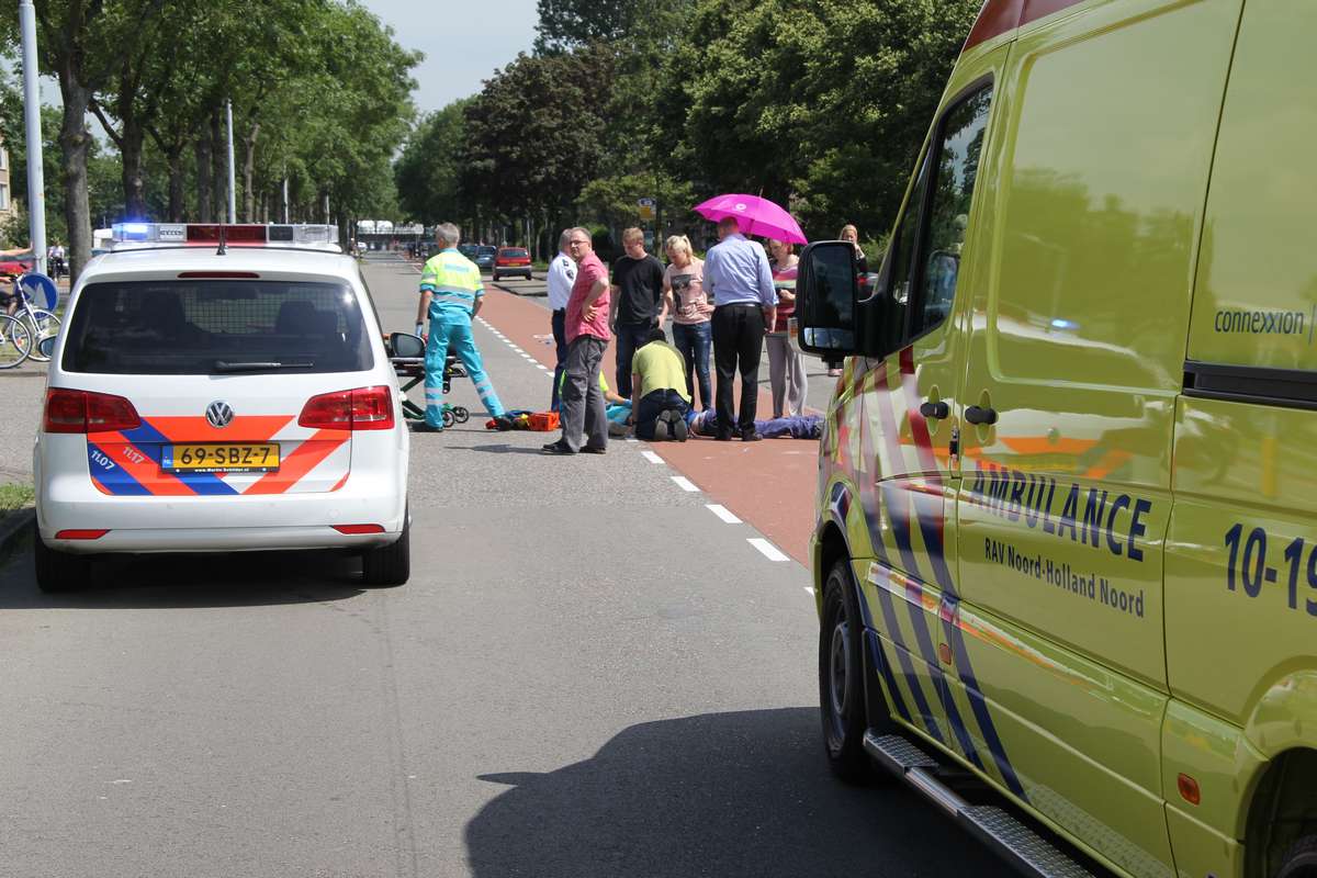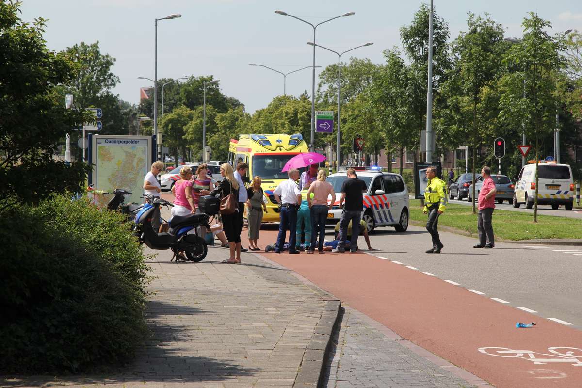 Alkmaar, 04 juli 2012. Een scooterrijder met passagier is woensdagmiddag in de Rijnstraat in Oudorp achterop een afslaande auto geklapt. De automobiliste kwam vanaf de Nieuwe Schermerweg en reed op de Rijnstraat richting de Waalstraat, maar wilde rechtsaf slaan de Scheldestraat in. De scooterrijder heeft die manoevre waarschijnlijk veel te laat in de gaten gekregen want ondanks de poging om te remmen klapte de scooter met flinke vaart achterop de Fiat Panda van de automobiliste. De passagier van de scooter kwam met de schrik vrij, maar de bestuurder is hard met de auto in aanraking gekomen. Hij is met onbekend letsel naar het ziekenhuis vervoerd.