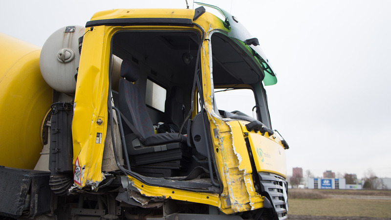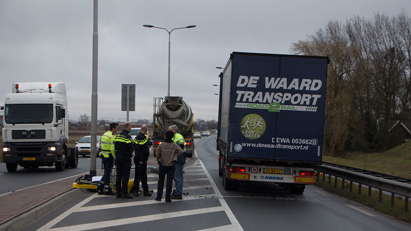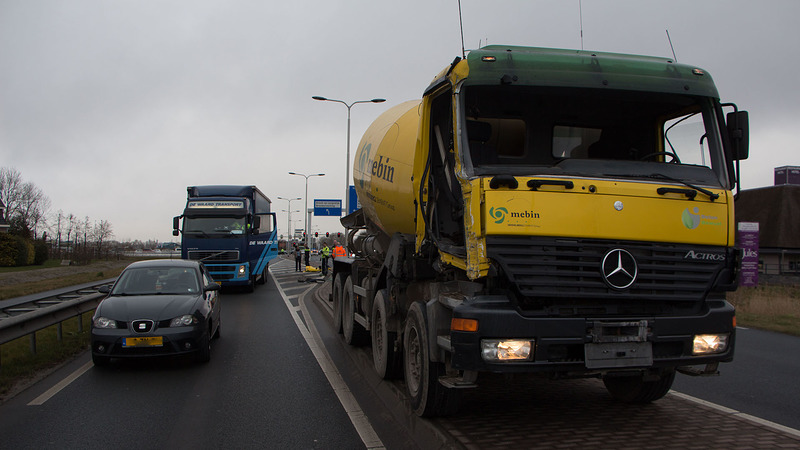De vrachtwagens waren samen met de andere weggebruikers opgetrokken bij de verkeerslichten in de richting van Alkmaar, toen de chauffeur van de achterste wagen, een betonwagen, zich liet afleiden door een personenauto die nog via het verdrijvingsvlak wilde voordringen.