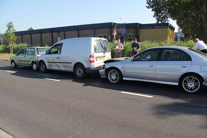 Alkmaar, 26 juli 2012. Donderdagavond heeft de zon een bijdrage gehad in een kop-staart botsing op de nieuwe Schermerweg waarbij vijf auto's betrokken waren. De bestuurder van de voorste auto remde af bij ter hoogte van de Westerstraat. De al wat lager staande maar toch nog felle zon maakte de remlichten slecht zichtbaar en dat leidde tot de nodige blikschade. Er is een ambulance ter plaatse geweest zodat het ambulancepersoneel de slachtoffers kon controleren maar er hoefde niemand naar het ziekenhuis. De rijbaan waarop de kettingbotsing plaatsvond is enige tijd afgesloten geweest. Het verkeer van beide kanten werd beurtelings door de politie om drie auto's die niet meer zelfstandig konden rijden heen geleid tot een bergingsbedrijf de baan weer vrij had gemaakt.