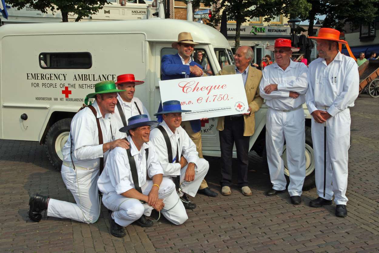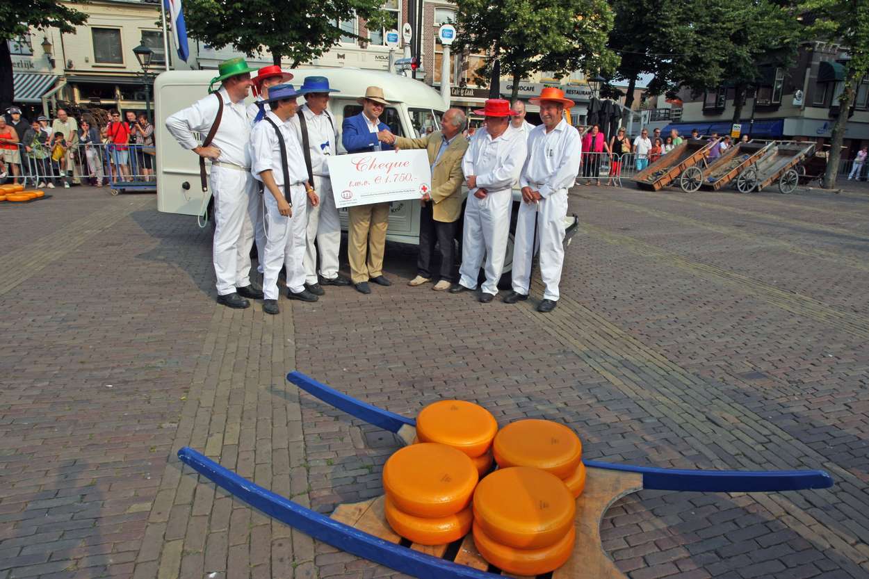 Alkmaar, 28 juli 2012. Vrijdagochtend heeft directeur Theo Middelbeek van Middelbeek Cars de bel van de Alkmaarse kaasmarkt geluid. Hij deed dat samen met Herman Becking, bestuurslid van de Stichting Historische verzameling Nederlandse Rode Kruis. Ze werden samen met hun echtgenotes op het Waagplein ontvangen door locoburgemeester Jan Nagengast. Tijdens de Laurensveiling van maart 2011 zijn enkele kavels geveild door burgemeester Bruinooge, onder andere ‘het luiden van de bel van de kaasmarkt’. Deze kavel  is gekocht door Theo Middelbeek. Vandaar dat hij de bel mocht luiden. De heer Becking is bestuurslid van de Stichting Vrienden van de Grote Sint Laurenskerk Alkmaar. Hij was in Alkmaar op uitnodiging van Theo Middelbeek. Middelbeek heeft geld ingezameld voor de stichting, met name voor het behoud van een historisch voertuig. Voorafgaand aan de kaasmarkt kreeg de heer Becking op het Waagplein een cheque ad € 1750 overhandigd van Middelbeek. Fotograaf Peter Heins was er ook bij en maakte deze fotoreportage.