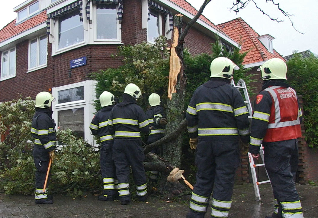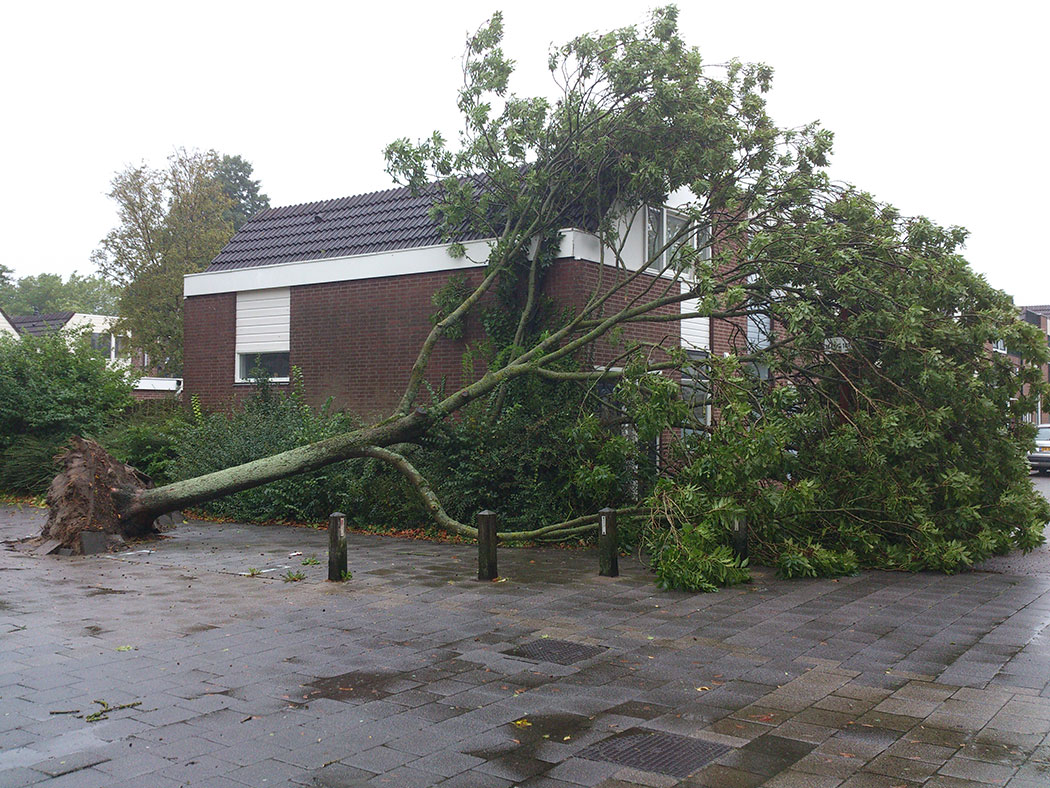Alkmaar, 24 september 2012. Ook Alkmaar ging maandagavond gebukt onder de druk van de eerste herftstorm van het jaar. In heel Noord-Holland regende het meldingen van afgeknapte takken en omgewaaide bomen. Ook uit heel Alkmaar kwamen meldingen binnen. In de Koggewaard viel een boom op een huis, de schade viel gelukkig mee, en ook in de Corfstraat gaf een boom de geest. De eigenaresse van een fiat Punto was minder gelukkig, de boom die in de Lombardijeweg stond viel er bovenop. Ook was er wateroverlast in het tunneltje bij de Fritz Conijnweg. Een eervolle vermelding was er voor de bewoners van een woninfg aan de Westerweg die vreesden dat een behoorlijk schuin staande boom de weg naar hun huis zou vinden en uit voorzorg de brandweer belden.