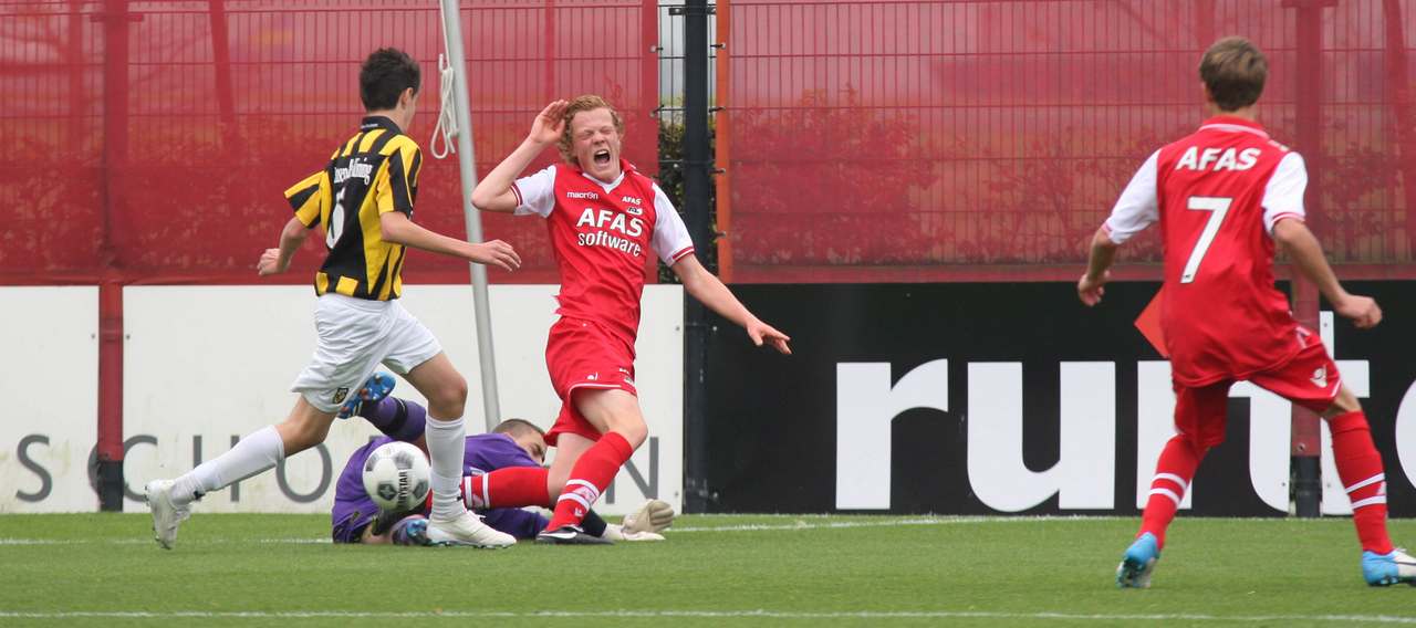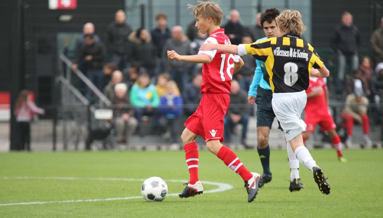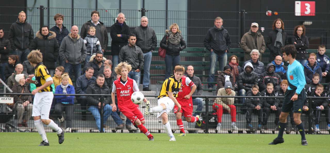 Alkmaar, 14 oktober 2012. Zaterdagmiddag was bij AZ voor de tweede keer een Non League day te beleven. Waar de eerste NLD een succes was qua bezoekersaantallen, was het sportief een tegenvaller want er moest een nederlaag genoteerd worden. Dat ging zaterdag aanmerkelijk beter! AZ Onder 15 wist namelijk Vitesse/AGOVV C1 te verslaan met een mooie en verdiende 2-1 overwinning. De AZ supporters gingen er ook vol voor en organiseerden een heus vuurwerk waardoor de sfeer er goed inzat en de jonge spelers zich serieus aangespoord voelden. En dat vertaalde zich al binnen twee minuten in de eerste treffer toen Teun Koopmeiners die met een mooi schot het net van de bezoekers wist te vinden. De tweede treffer kwamop naam van Ferdy Druijf waarna Vitesse/AGOVV nog meteen aandrong en AZ een tegentreffer moest incasseren. De tweede helft liet zien dat het spel van AZ zich op een net wat hoger niveau bevond, maar dat vertaalde zich niet meer in een extra treffer. Het optreden van doelman Sven Verswijveren is zeker het vermelden waard: hij toonde zich uitermate bekwaam en zelfverzekerd. Sportfotograaf Peter Heins maakte het spektakel mee en maakte deze reportage..