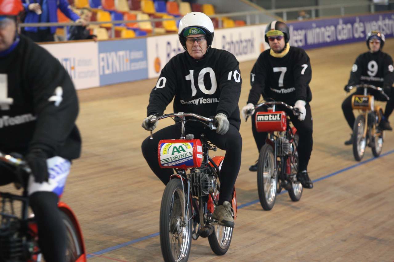 Alkmaar, 15 oktober 2012. Iedere wielerliefhebber weet het wel, maar er zijn ook heel veel mensen die niet weten wat een Derny is. Een Derny is zo'n brommertje dat bij wielerwedstrijden gebruikt wordt om achter te rijden, te 'stayeren'. De dernyrijder kan indien gewenst zelf meetrappen. Derny is een merknaam die in de loop der jaren een soortnaam is geworden. Net als tegenwoordig (bijna) iedereen een navigatiesysteem een TomTom noemt en een plastic bakje Tupperware.In Sportpaleis Alkmaar aan de Terborchlaan was zondag zo'n Derny waarbij snelheden van 70 km/u niet ongebruikelijk zijn. De deelnemers waren zowel dames als heren uit alle categorieën, behalve de jeugd van categorie 1 t/m 5. Het was een internationeel deelnemersveld met Duitse en Engelse deelnemers die minimaal twee wedstrijden reden.