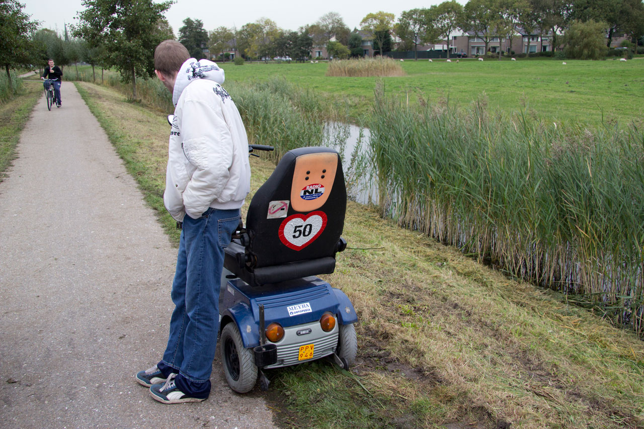 Alkmaar, 21 oktober 2012. Commotie vrijdagmiddag bij de Waalstraat. Voorbijgangers hadden sporen gevonden die vanaf het pad door het riet heen het water inliepen, en een met kroos bedekte booster. Ze vreesden het ergste. Omdat snelheid bij dergelijke meldingen van het grootste belang is spoedden politie, brandweer en ambulance zich naar de plek des onheils. Eenmaal ter plaatse kwam al snel naar boven wat er was gebeurd. Er was inderdaad iemand met de booster het water in gereden, maar het ging niet om iemand die invalide was, maar om een jongeman die de booster in zijn eentje niet op de kant kreeg en er niet in was geslaagd hulp van voorbijgangers te krijgen. Daarop had hij de plek verlaten om hulp te halen en terwijl hij weg was hadden andere voorbijgangers gemeld dat er een booster in het water was gereden. Evensnel als de hulpdiensten waren gekomen verdwenen ze weer. Gezien de hoeveelheid buurtbewoners die er op af was gekomen was het een welkome afleiding.