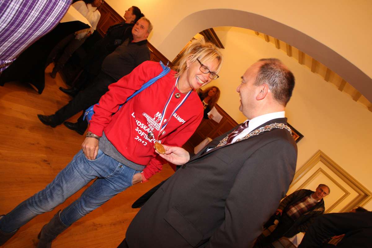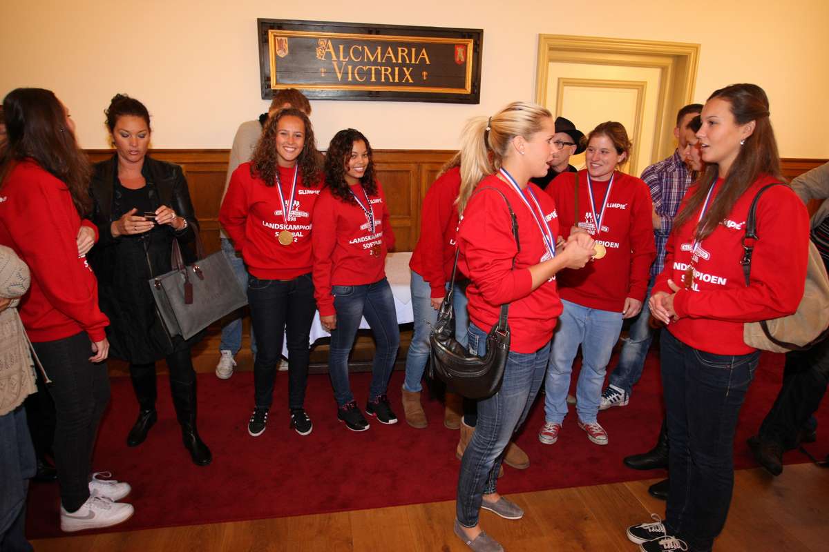 De gemeente is trots op deze geweldige prestatie en had de sporters en coaches daarom uitgenodigd om op het stadhuis gehuldigd te worden. Dat dit in de Prinsenzaal gebeurde gaf het geheel net nog iets meer cachet. In die zaal hangt namelijk een bord boven de schouw, met daarop de woorden 'Alcmaria Victrix'. De wethouder liet na zijn toespraak trainster Gonny Farly aan het woord. Zij sprak de aanwezigen in het Engels geanimeerd toe om het Canadese teamlid niet buiten te sluiten. Ze vertelde dat de dames aanvankelijk niet zoveel vertrouwen bezaten, maar toen de tweede inning van de laatste wedstrijd binnengehaald werd werd veranderde kwam het geloof. De winst vond ze een van de beste en meest speciale ervaringen in haar leven. Ook zij bedankte alle betrokkenen, van vrijwilligers en ouders tot stafleden en het bestuur. De durf van het jonge bestuur was een belangrijke steun voor haar meerjarenplan, waarmee de 'legertje' stapsgewijs het land moest veroveren. En plan dat een jaar sneller dan gepland voltooid is. Als slot riep zij haar team op om hun clublied te zingen, wat dan ook enthousiast gedaan werd.