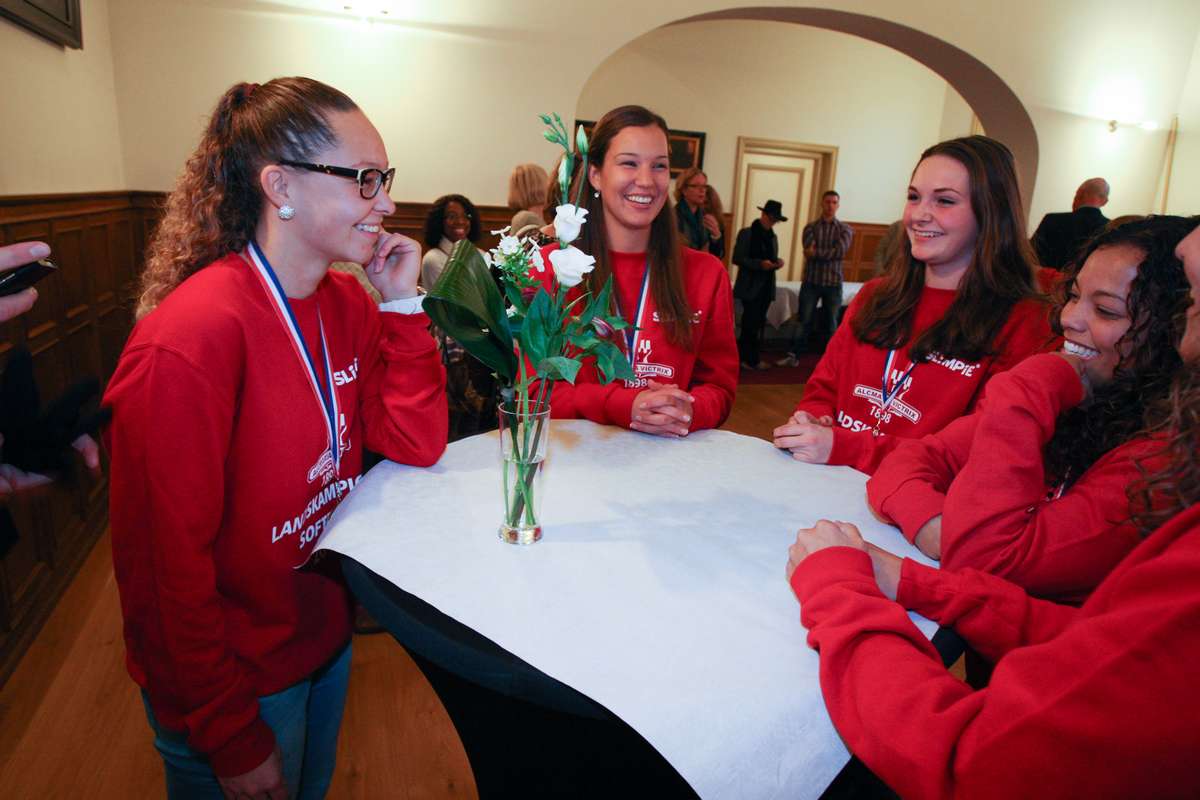 Alkmaar, 30 oktober 2012. Er waren bloemen, hapjes, blije gezichten en er was dinsdagmiddag vooral veel rood in de Prinsenzaal in het Stadhuis van Alkmaar. Team en coaches droegen namelijk allen een rode trui van hun sponsor, met daarop een grote '1'. Een zichtbaar opgetogen en trotse wethouder De Baat hoefde zich nu eens niet te buigen over begrotingen of reorganisaties maar mocht de softbaldames van Alcmaria Victrix in het zonnetje zetten. Daarbij werden natuurlijk ook de coaches niet vergeten. Drie weken geleden zijn de dames van Alcmaria op sensationele wijze landskampioen geworden. Het Dames 1 team heeft vanuit een 'underdog' positie in twee zinderende finalewedstrijden hun grootste concurrent Sparks weten te verslaan en daarmee de landstitel naar Alkmaar gehaald.