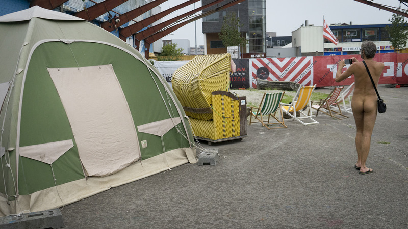 De nudisten zijn deelnemers aan het festival Onder de Blote hemel dat in HAL25 op Overstad wordt gehouden. Er is aan alles gedacht en men is daar van alle gemakken voorzien zoals een bioscoop en een jacuzzi. Maar geen museum. Vrijdag stond daarom een bezoek aan het Stedelijk Museum op het Canadaplein op het programma, vandaar de wandeling van HAL25 naar het Canadaplein.