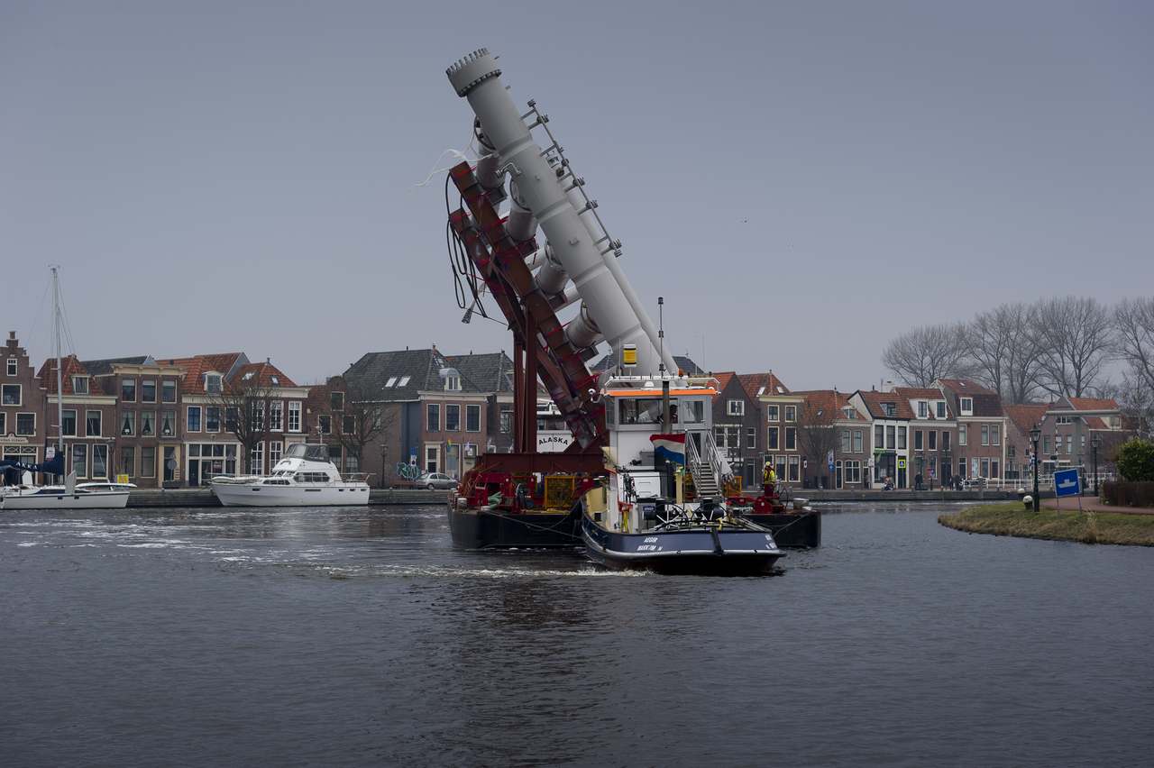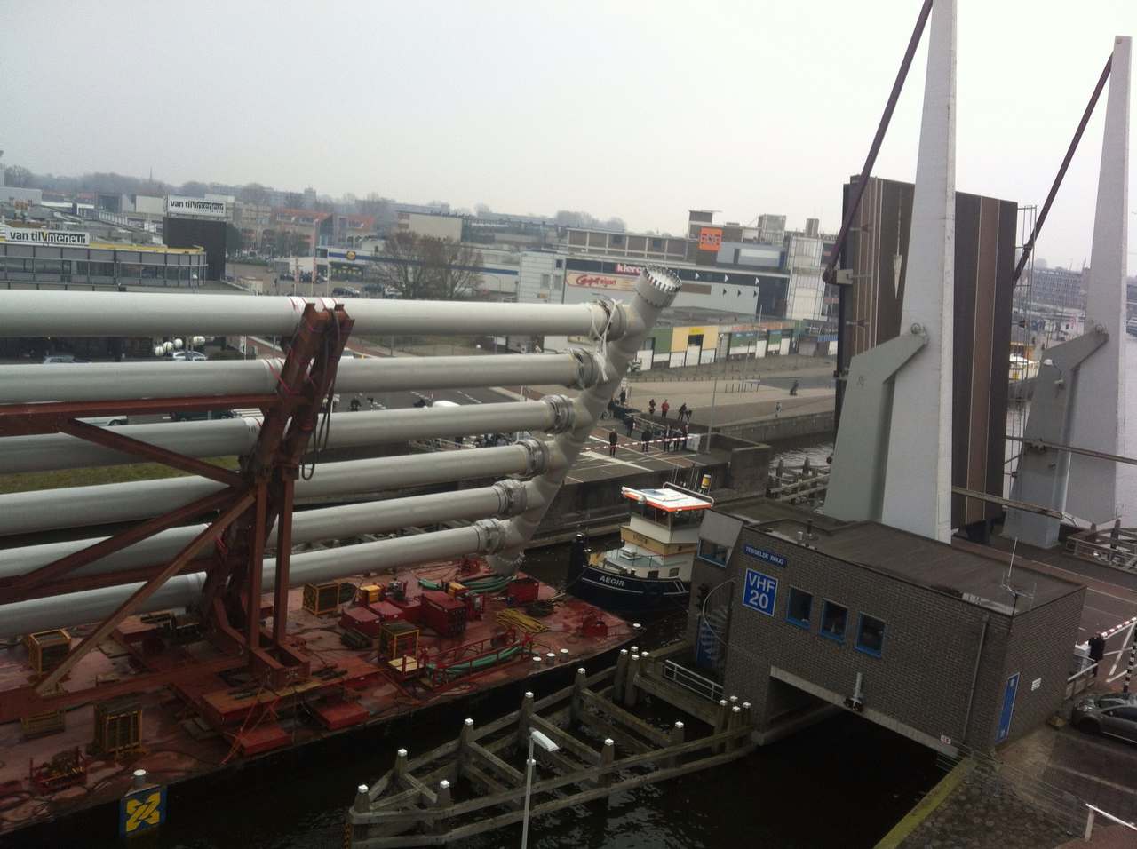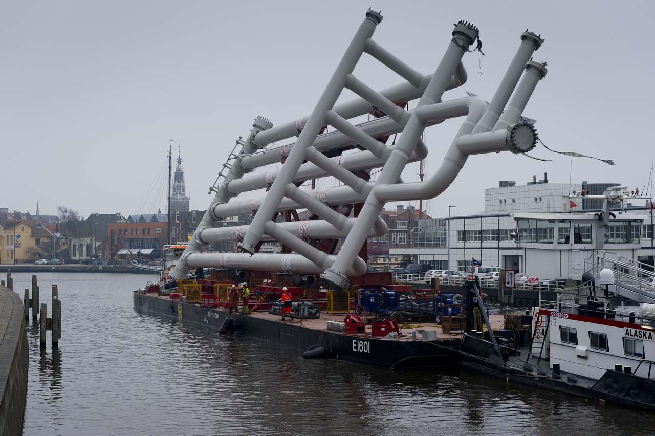 Aan de Boekelerdijk wordt de slugcatcher vanaf het schip aan land gehesen om naar de gasbehandelingsinstallatie op het Alkmaarder bedrijventerrein Boekelermeer gebracht te worden. De slugcatcher is 58 meter lang, ruim 17 meter breed, 8 meter hoog en weegt 550 ton. De foto's van het passeren van de Tesselse brug zijn genomen door Annette Van Dijk.