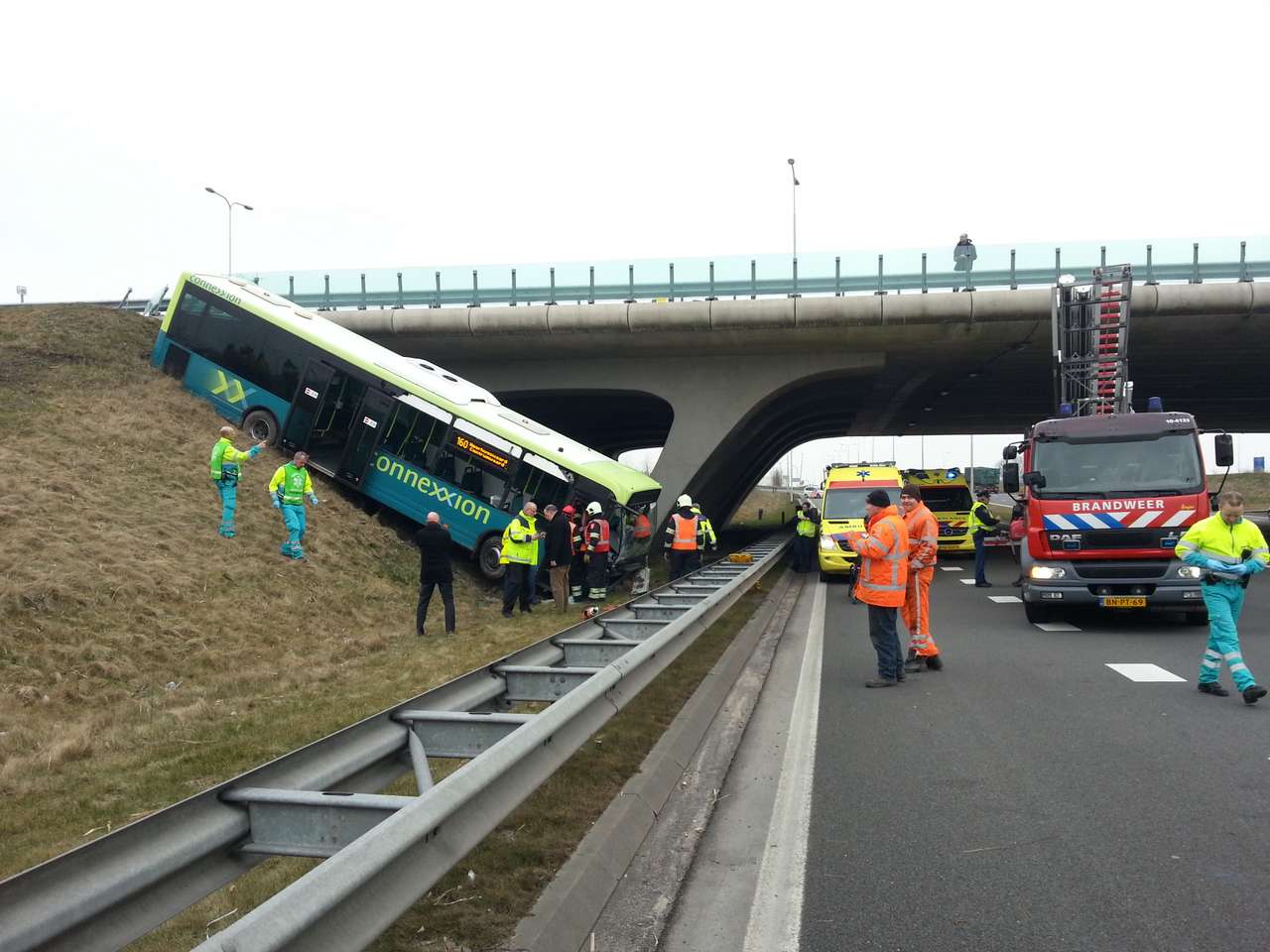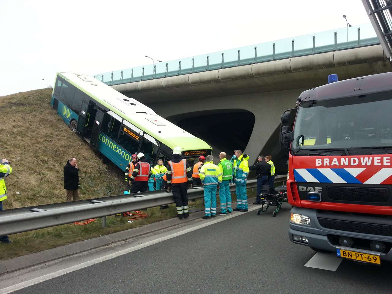 Alkmaar, 20 maart 2013. Woensdagochtend is even na 10.30 uur een Connexionbus het talud bij de N242 afgereden na een aanrijding met een personenauto. De bus belande tegen de vangrail van de N242. De chauffeur van de bus was goed aanspreekbaar maar werd licht gewond overgebracht naar het ziekenhuis. De 35-jarige bestuurster van de auto en haar 2-jarige zoontje zijn ook overgebracht naar het ziekenhuis. Op dit moment is niet bekend wat de aard van hun verwondingen is. Naar de toedracht van het ongeval wordt onderzoek gedaan. De N242 was enkele uren afgesloten in verband met onderzoek en takelwerkzaamheden. De regionale- en landelijke media stortten zich allemaal op het ongeval waardoor er diverse straalwagens op de plaats van het ongeval geparkerd stonden.