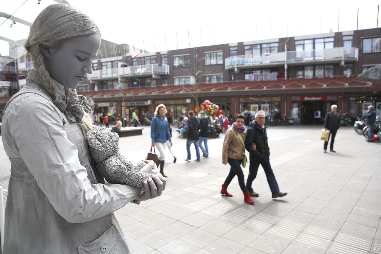 Alkmaar, 27 april 2013. Bezoekers van Winkelcentrum De Mare werden zaterdagmiddag regelmatig door rondlopende acteurs op het verkeerde been gezet en vroegen zich dan af: ‘is deze nou echt of niet?’. De acteurs waren aanwezig als onderdeel van de hoofdact: de Living Statues Contest'. Geïnspireerd door de levende standbeelden in'La Rambla', Barcelona's belangrijkste winkelstraat, was er een wedstrijd georganiseerd. Deelnemers konden een wisselbeker winnen en maakten kans op cadeaubonnen. Maar naast de living statues was er ook straattheater en vertoonden acteurs van dansstudio Dentro hun hiphop-kunsten. Zelfs het publiek maakte kans op een prijs door te stemmen op de beste acteur. Alkmaar centraal fotograaf Marco Schilpp had een makkie aan de statues, zo'n mooi stilstaand en toch levend onderwerp komt hij maar zelden tegen...