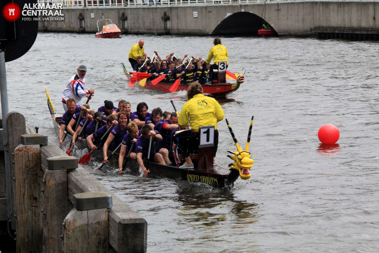 Alkmaar, 03 juni 2013. Zaterdag en zondag was het NoordHollands Kanaal voor de Noorder Arcade weer het strijdtonel van het altijd spectaculaire drakenbootracen. Wie legt de afstand tussen de Ringers- en de Friesebrug in een zo kort mogelijke tijd af en mag zich met zijn team Drakenboortkampioen noemen? Zaterdag zijn traditioneel de amateurs en de gelegenheidsteams aan de beurt. Eventuele tekortkomingen in techniek worden hier vaak ruimschoots gecompenseerd door fanatisme en doorzettingsvermogen. Drakenbootracen is een echte teamsport. Wanneer de roeiers niet precies gelijk en op de maat van de drum opereren halen individuele prestaties niets uit. Op zondag waren de gladgestreken technieken van de meer ervaren teams te aanschouwen. De snelheden lagen hier dan ook behoorlijk wat hoger. De Alkmaarse drakenbootvereniging 'United Dragons' geeft gelegenheidsteams ieder jaar de kans om eens aan deze spectaculaire sport te snuffelen. Clubfotograaf Paul van Berkum maakte deze mooie foto-impressie.