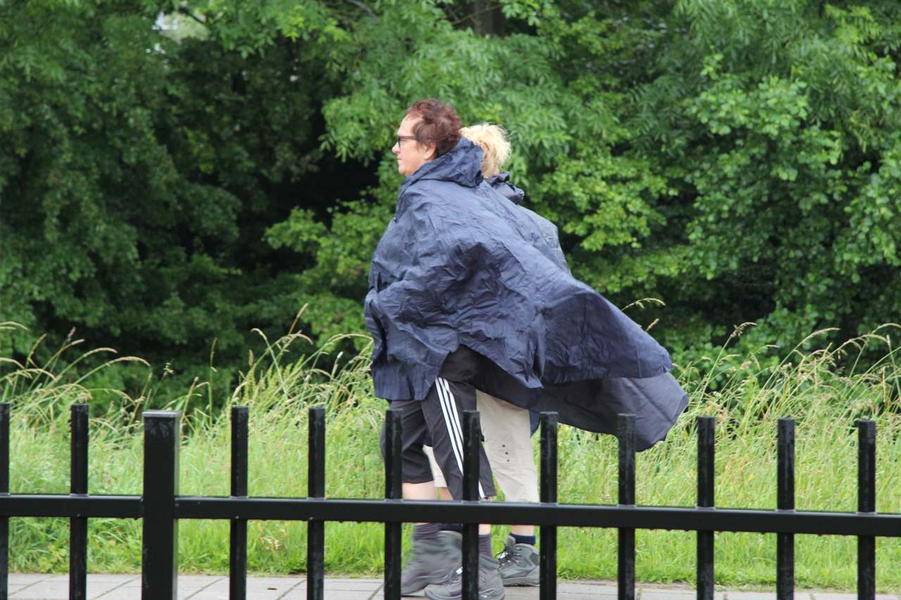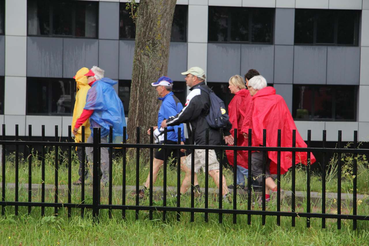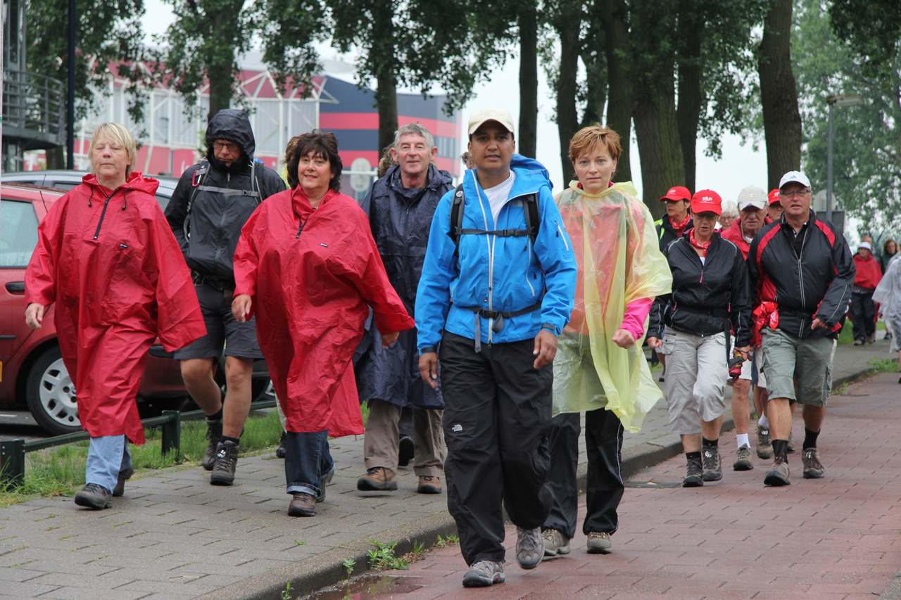 Alkmaar, 21 juni 2013. Wat vanmorgen begon met een miezerig buitje mondde uit in een gestage neerwaartse beweging van de nodige waterdruppels. Er was geen ontsnapping mogelijk en alle wandelaars van de Egmondse Abdij/Heilooerbosroute waren nat tot op het bot. Opvallend was dat de meteorologische misère simpleweg weggelachen werd. De stemming was uitstekend en het was bijzonder om zoveel vrolijke mensen bij elkaar te zien onder dergelijke omstandigheden. Winkelcentrum Heiloo was het punt waar alle wandelaars langs kwamen en daar was gezorgd voor muziek en vertier. Maar het winkelcentrum bleek de grootste aantrekkingskracht uit te oefenen op de deelnemers en het duurde dan ook niet lang voor er een bonte verzameling van op de grond en tegen de muur zittende regencapes te bewonderen was.