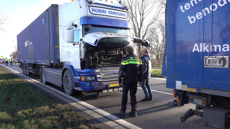 Door de schade wilde de motorkap van de achterste vrachtwagen niet meer sluiten, maar omdat de chauffeur nog maar 200 meter moest rijden naar zijn bestemming, mocht hij doorrijden,. Ook bij de andere voertuigen viel de schade mee.