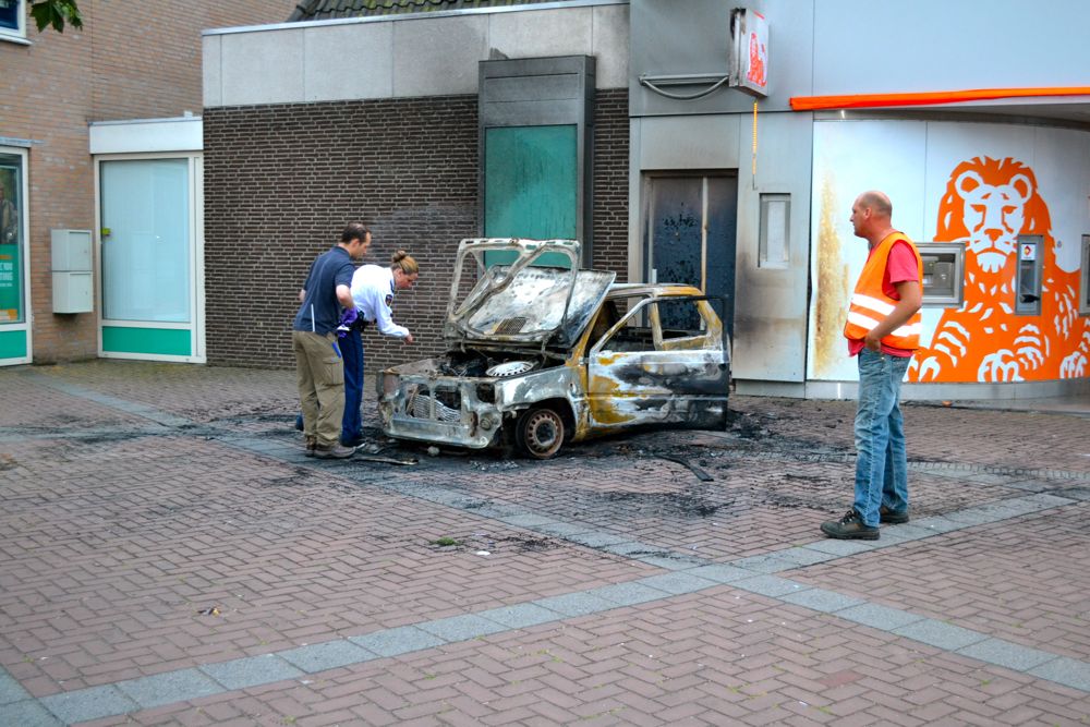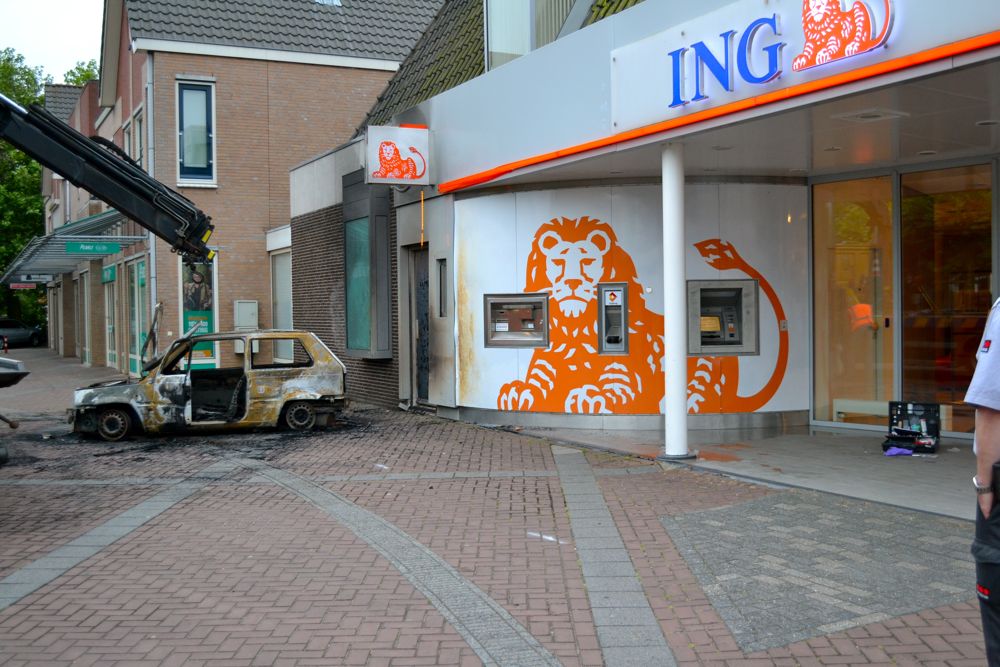 Heiloo, 20 juli 2013. In de nacht van vrijdag op zaterdag is de ING pinautomaat aan de Heerenweg in Heiloo het lijdend voorwerp geweest van een poging tot plofkraak. Rond 04.15 uur kwam de bewaking poolshoogte nemen en trof een hevig brandende auto bij de bank aan. Snelle actie van de brandweer kon ernstige schade aan het bankgebouw voorkomen. Na een grondige inspectie om er zeker van te zijn dat er geen explosiegevaar (meer) was kon de recherche starten met het sporenonderzoek. De politie heeft met een helikopter de omgeving afgezocht, maar er is niemand aangehouden. Het is onbekend of er iets is buitgemaakt