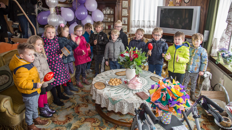 Jan's huis was versierd met een boog die door alle schoolkinderen gemaakt was. Alleen de jongsten gingen op bezoek, omdat het anders wel erg vol zou worden. Ze zongen liedjes voor Jan en gaven hem een bosje zelfgemaakte ‘bloemen’. De jarige Job liet ze ook nog even de mooie grote verjaardagstaart zien. Geen Abraham, maar een ‘Methusalem’.