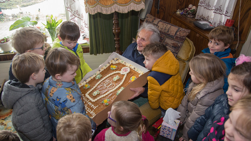 Dinsdagochtend gingen de kinderen van groep 1 en 2 van de Vinckhuysenschool op verjaardagsvisite bij Jan Bakker in West-Graftdijk. Hij werd vandaag namelijk 100 jaar. 's Middags was is er in het kerkje van West-Graftdijk een feestelijke receptie, waarbij burgemeester Bruinooge aanwezig was om Jan te feliciteren.