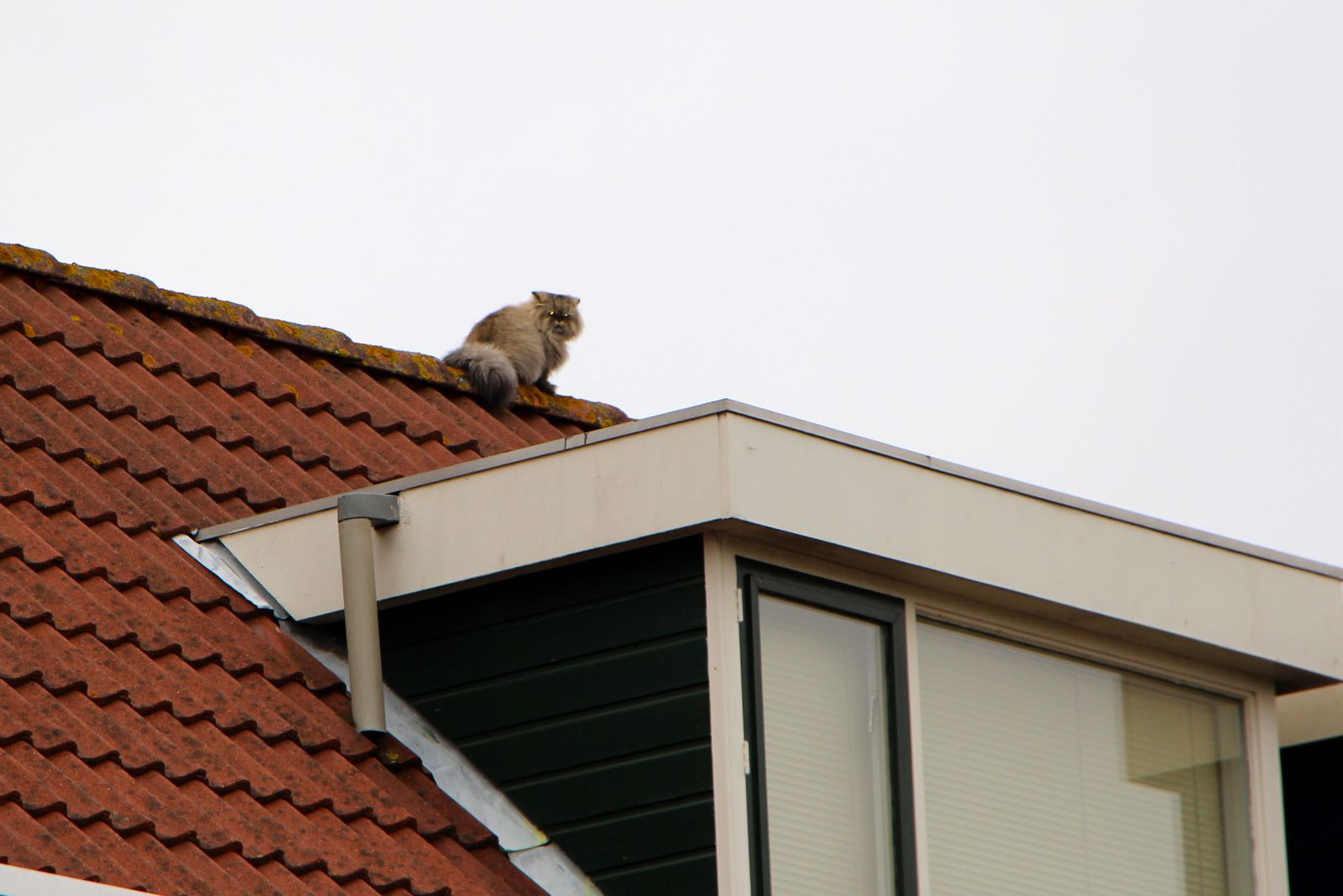 Alkmaar, 17 november 2013. Zondagochtend werd de brandweer opgeroepen vanwege een 'dier in nood'. Het bleek te gaan om een Perzische kat die zijn (of haar?) toevlucht had gezocht op het dak van een rijtje huizen in de Hudsonstraat. Het dier wilde of durfde niet meer naar beneden. De eigenaar had de hele nacht geen oog dicht gedaan vanwege het jankende beest en alle andere mogelijke oplossingen waren jammerlijk mislukt. Dus moest de brandweer uitkomst bieden. Die verscheen met de hoogwerker en een aantal brandweermannen.