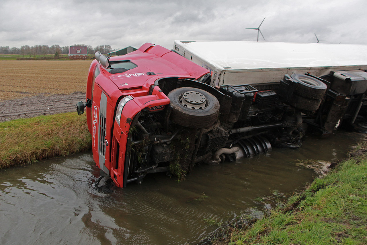 Alkmaar, 27 december 2013. Een vrachtwagenchauffeur die donderdagmiddag over de N242 tussen Heerhugowaard en Alkmaar reed kreeg de schrik van zijn leven. Zijn vrachtwagen leek er zelfstandig voor te kiezen rechtsaf de berm in te gaan. Het verlies van controle over de truck met oplegger is waarschijnlijk veroorzaakt door een losgeschoten bout van de stuurstang. De koerswijziging was behoorlijk abrupt omdat de chauffeur tegen de wind in naar links moest sturen om de weg te volgen. Toen de bout losschoot werd de wagen van de weg afgeblazen de berm in, waarna de combinatie op zijn kant in een slootje eindigde. De chauffeur kwam er met lichte verwondingen vanaf en hoefde niet naar het ziekenhuis.Β De N242 was ter hoogte van Afslag Beverkoog in zuidelijke richting afgesloten.