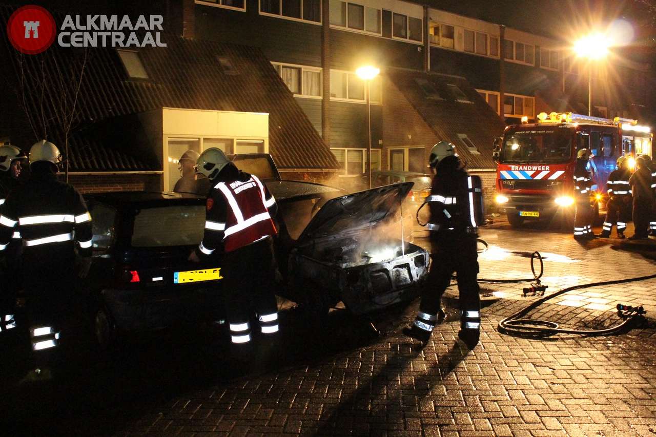 Alkmaar, 15 januari 2014. In de nacht van dinsdag op woensdag werd kwart voor vier door bewoners van de Houtduifstraat een brandende auto ontdekt. De brandweer werd onmiddelijk gealarmeerd, maar tegen de tijd dat de spuitgasten ter plaatse kwamen stond de auto al volledig in lichterlaaie en viel er weinig meer te redden. Ook de naast de brandende Fiat Panda geparkeerde Renault Twingo liep door de vlammen en de hitte schade op. Hoewel niemand daadwerkelijk heeft gezien dat iemand de auto in brand heeft gestoken, zijn de omstandigheden verdacht genoeg om de technische recherche onderzoek te laten doen naar de brand. (FOTO's: DNP.NU/Lorenzo Derksen)
