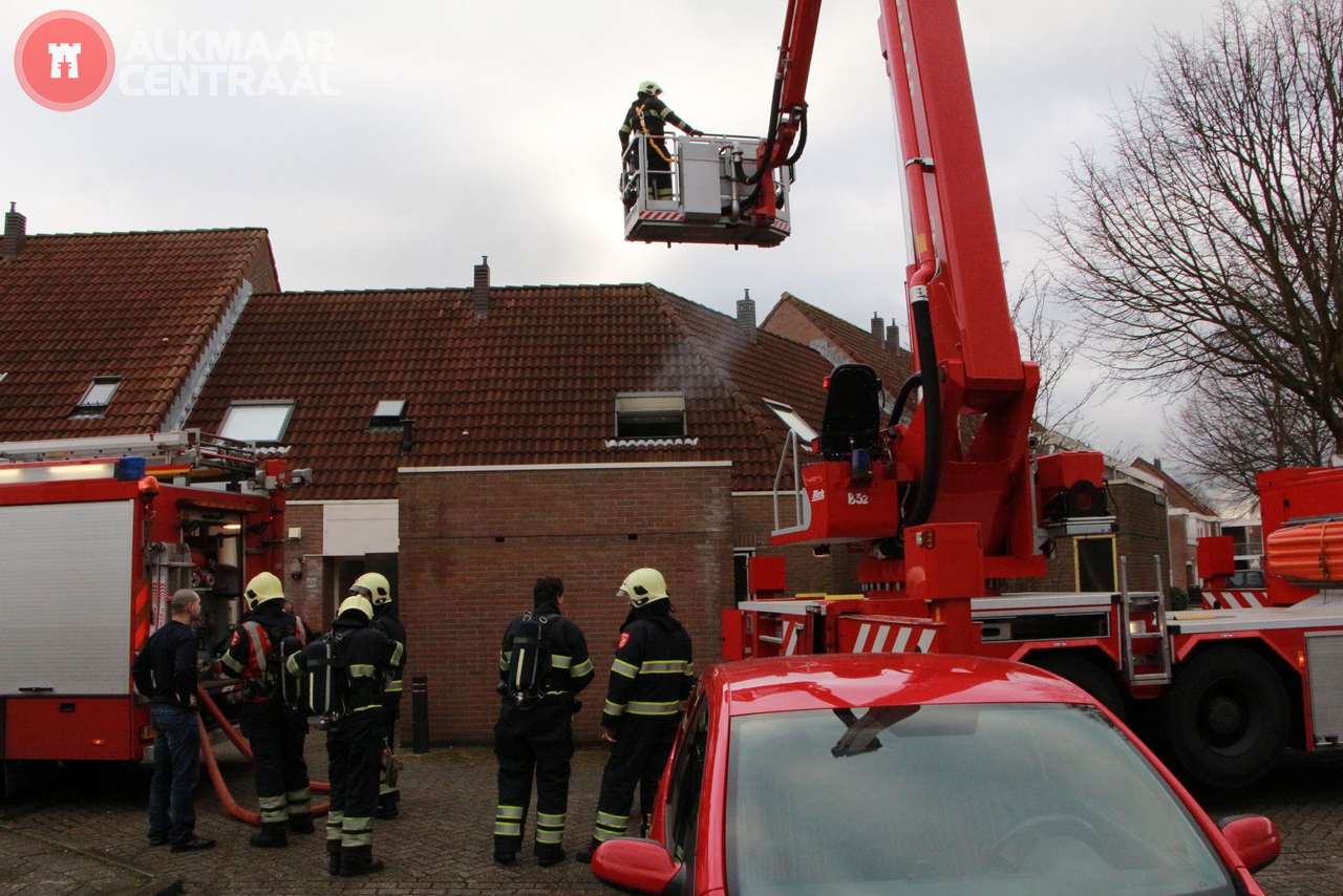 Alkmaar, 24 januari 2014. Vrijdagmiddag werd de brandweer opgeroepen in verband met een binnenbrand in een huis in de Bakkerstraat. Bij aankomst troffen de brandweerlieden een huis vol rook aan. Het vuur bleek zich na enig zoeken tussen het plafond en het dak te bevinden en het had al een gat in het dak gebrand. De brandweer kon verdere escalatie voorkomen. De oorzaak van de brand is nog niet bekend. Het huis heeft de nodige rook- en roetschade opgelopen, Salvage zal de verzekeringszaken met de bewoner afhandelen. De buurt was massaal uitgelopen om de brandweer aan het werk te zien. (Foto's: DNP.NU)