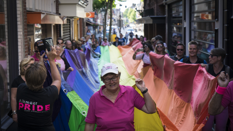 Donderdagavond is in de Stadskantine in het Ringersgebouw de Alkmaar Pride officieel van start gegaan. De Pride werd geopend door wethouder Pieter Dijkman en cabaretier Merel Moistra door een 20 meter lange regenboogvlag aan het gebouw te hangen.