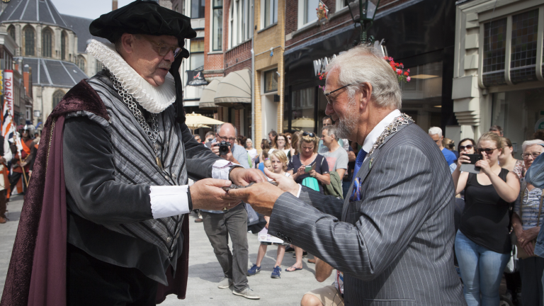 Zaterdagochtend ging de Bonte Stoet met 500 Kaeskoppenstad figuranten van het Verdronkenoord over de Laat en de Koorstraat richting het stadhuis waar burgemeester van het Alkmaar van nu Piet Bruinooge de sleutel van de stad voor 2 dagen overdroeg aan de burgemeester van het Alckmaer van 1573 Floris van Teylingen.