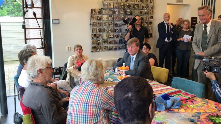 Samen met de burgemeester, begon Willem-Alexander zijn rondleiding door het opgeknapte pand. Tijdens de tour deed hij onder andere langs bij een yoga-les, een breiclub en kaartgezelschap. (foto's: Anne Klijnstra)