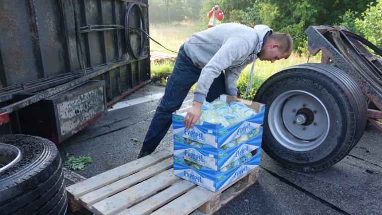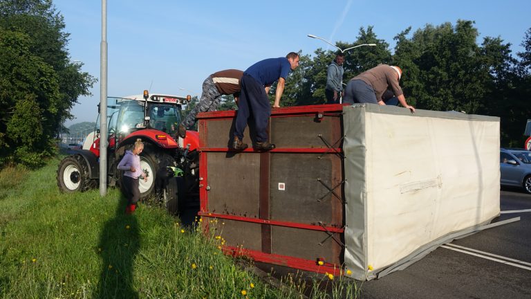 Met mechanische hulp en vele opgeroepen 'handjes' is de ijsbergsla opgeruimd en de aanhanger weer rechtop gezet.