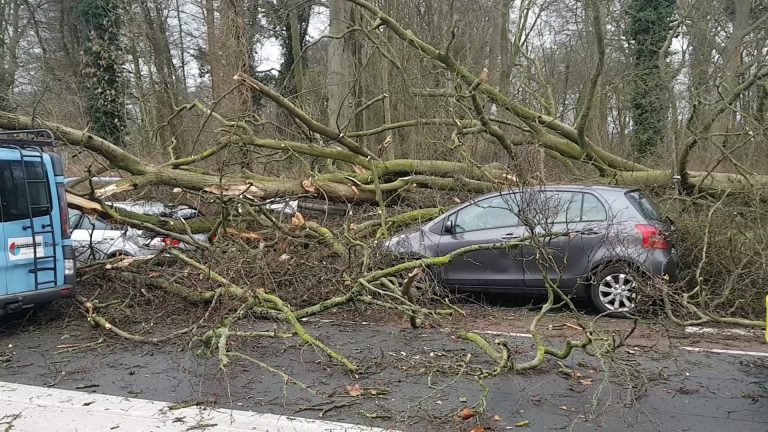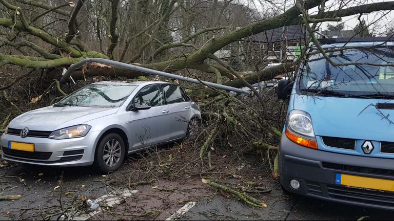 Vooral de man in de grijze VW kwam goed weg. De boom werd deels opgevangen door de bestelbus naast hem, waardoor alleen de achterzijde van zijn auto vol werd geraakt, en de mee omgetrokken lantaarnpaal bleef net boven het dak hangen.