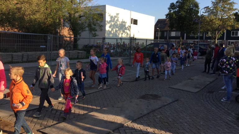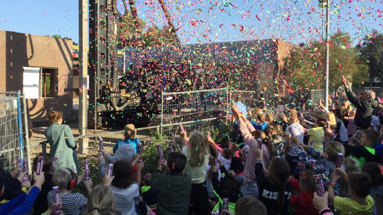 Dinsdag werd de eerste paal geslagen voor het nieuwe gebouw van o.b.s. De Wiekslag in Stompetoren. De kinderen, de oudsten hielpen de kleintjes, liepen samen naar de bouwplaats. Sven en Tobias hadden de eer om met de grote heimachine de eerste paal te slaan. Tegelijkertijd lieten alle kinderen hun confetti-kanon afgaan en dat leverde een prachtig gezicht en veel geknal op.