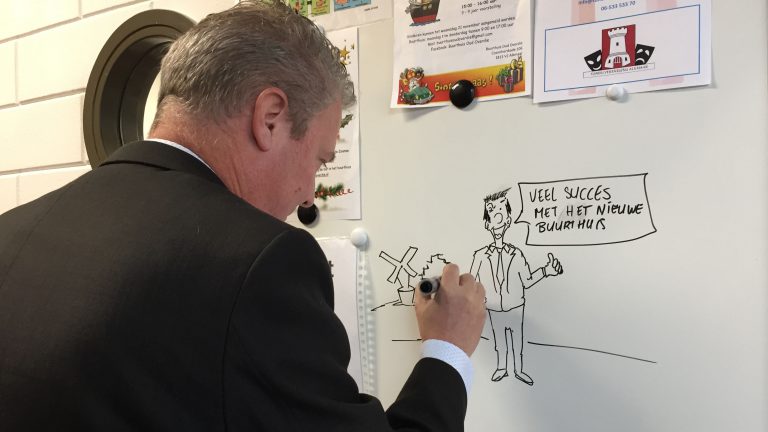 De wethouder laat ook weten dat er binnen het College plannen worden besproken over de investeringen. "De voorzitters van Alkmaarse buurthuizen hebben zelf een plan gemaakt wat binnenkort in de Raad besproken wordt. Daarna kunnen we er in gaan investeren, want dat is het waard. Investeren in belangen voor mensen is heel belangrijk", aldus de wethouder. Als aandenken aan zijn bezoek maakte Van Zon een leuke tekening op het whiteboard in de hal van het buurthuis, met de tekst: 'Veel succes met het nieuwe buurthuis. Groet, Marcel van Zon.'