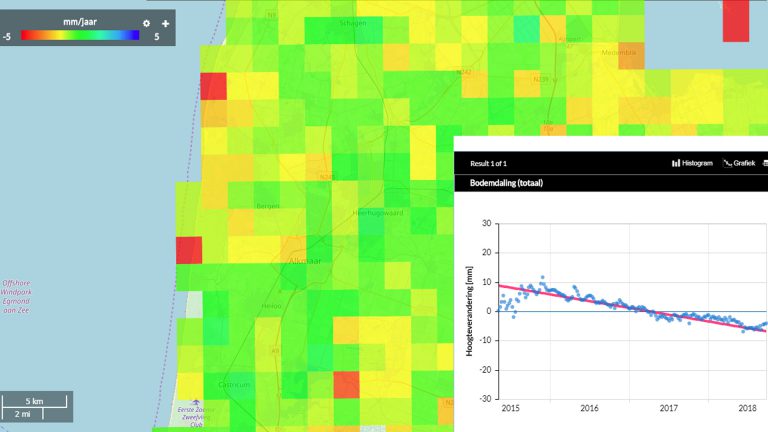 De Nederlandse bodem is dit droge jaar meer gedaald dan gedacht. Dat blijkt uit dinsdag gepubliceerde gegevens van het Nederlands Centrum voor Geodesie en Geo-informatica (NCG). Het HAL-gebied kende voor ongeveer de helft beperkte daling van 2,0 - 2,5 mm. Problematischer is het hoge risico op 'palenpest' in de natte gebieden van de gemeenten Alkmaar en Langedijk, zo blijkt uit een tweede kaart.