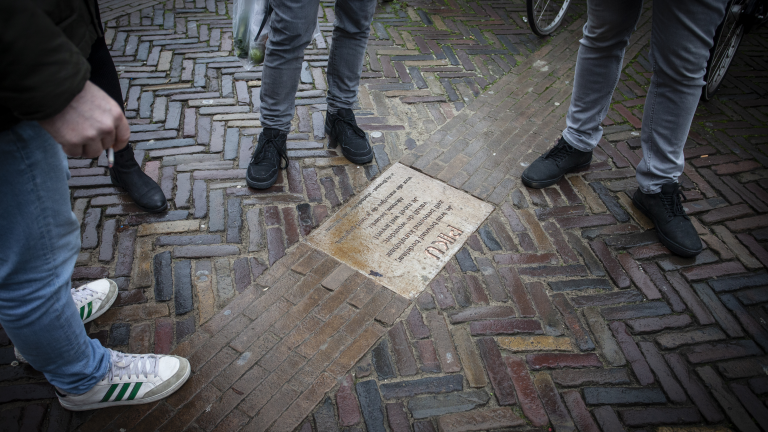 Alkmaarse stadsdichter Joris Brussel heeft de tekst op de gedenktegel bedacht: 'Piku. Je was bewust bedelaar, zelf benoemend kunstenaar vanuit de woorden: Je moet wel leven! Alkmaar, bedankt, voor alle eurootjes die je hebt gegeven.' Alkmaar Centraal fotograaf Marco Schilpp maakte een fotoreportage die te zien is op onze Facebookpagina. (foto: Marco Schilpp)
