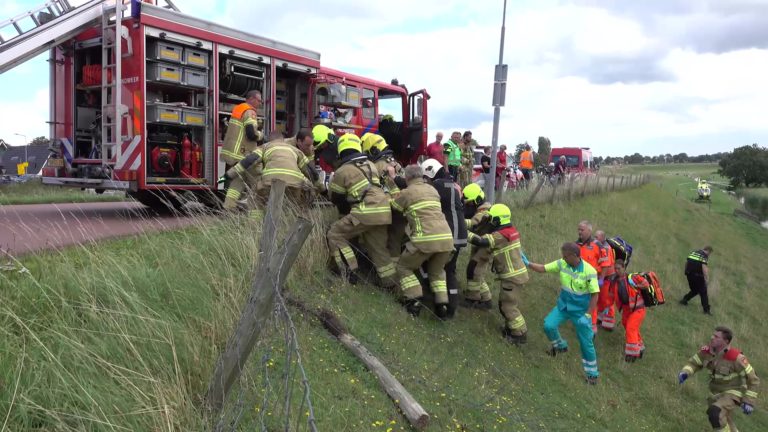 De brandweer moest de man uit zijn benarde positie bevrijden waarna hij op een brancard en met vereende krachten de steile deijk werd opgedragen. Hij is per ambulance naar het ziekenhuis gebracht.