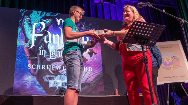 Wouter van Mispelaar, winnaar van de jongerenschrijfwedstrijd (met als thema ‘Fantasy in Langedijk’) kreeg een prijs overhandigd, bestaande uit enkele boekjes.