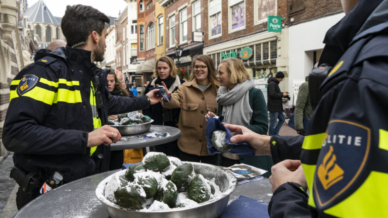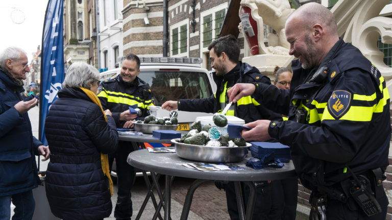 Zaterdagochtend en -middag deelde de politie blauwe oliebollen uit in winkelcentrum De Mare en in de Alkmaarse binnenstad. De bollen zijn in ieder geval een aanknopingspunt voor een gesprekje en dat is waar het ook om gaat. Tijdens de ludieke actie wil de politie vooral de veiligheid en de eigen invloed daarop nog eens extra onder de aandacht brengen.