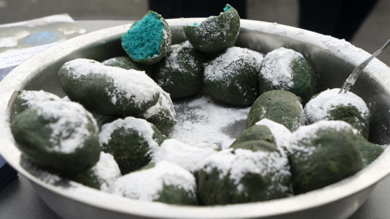 Een beetje onwennig kijkt iedereen in eerste instantie naar de toch wel vreemd gekleurde oliebollen. Dat de buitenkant een schimmelachtige kleur heeft helpt niet. Maar na een laatste "kan het echt?" wordt er dan toch gehapt en komt het 'politieblauw' tevoorschijn.