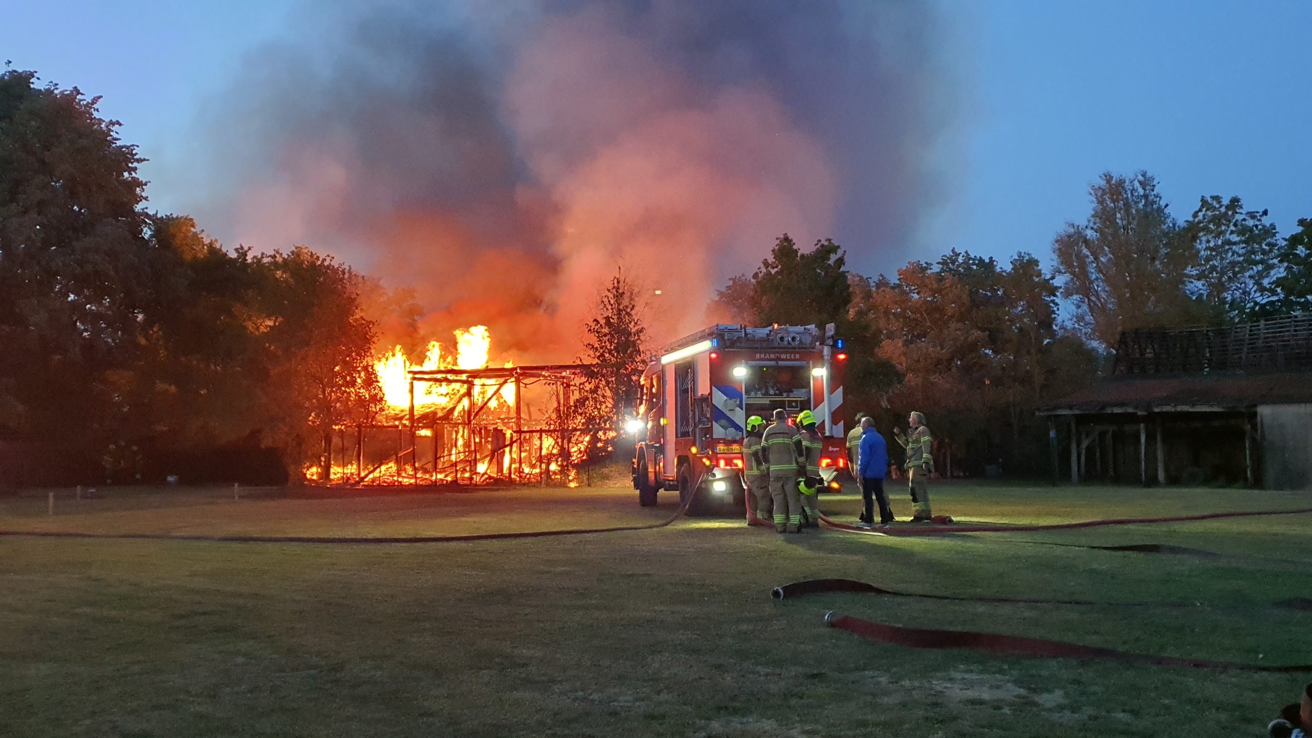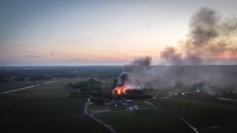 Toch werd er nauwelijks geblust. De brandweer besloot zich te concentreren op het voorkomen van overslag naar de nabij gelegen huizen met een rieten dak en liet de schuren gecontroleerd uitbranden. Bij de brand kwam veel rook vrij, de rookkolom was in de wijde omtrek te zien. (dronefoto's: Gijs van Dalen)